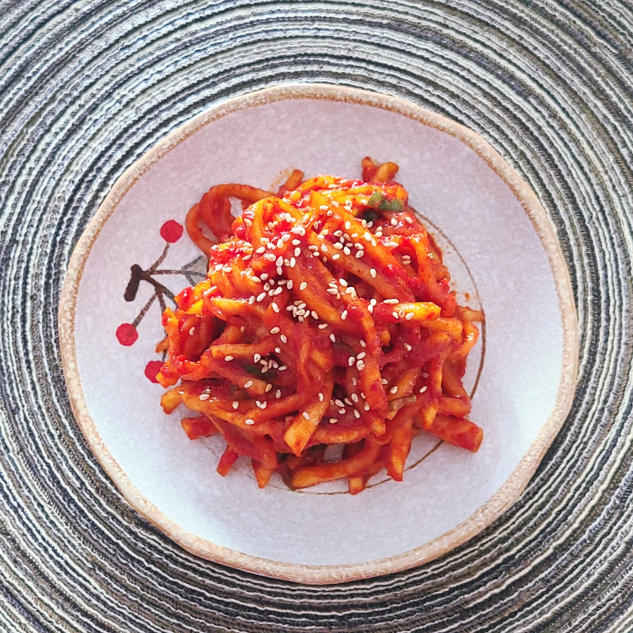 완성된 무생채는 적당량 덜어서 예쁜 접시에 담아냅니다. 여기에 통깨를 뿌리거나 쪽파로 장식하면 비주얼도 훨씬 돋보입니다! 밥과 함께 비벼 먹거나 고기 요리와 곁들여 내면 그 조화가 정말 환상적입니다.