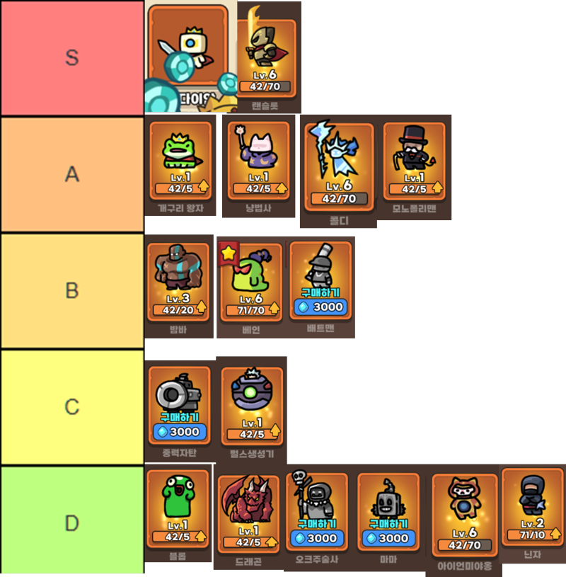 A 티어 (상위) : 개구리 왕자 (킹 다이안) / 배트맨 / 아이언미야옹 / 베인